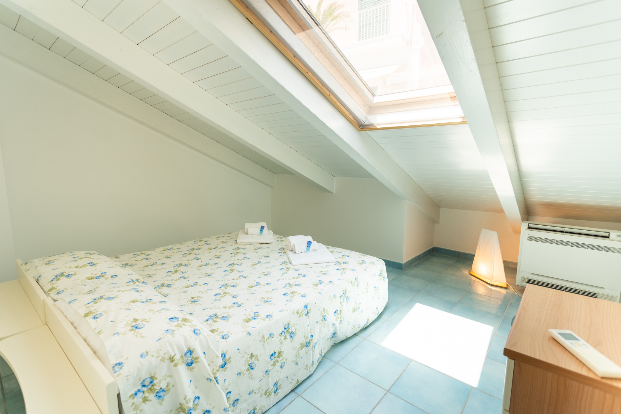 The accommodation is fully air conditioned and has the open-plan living/dining room/kitchen and a complete bathroom at the entrance level, whereas on the upper floor you will have the two bedrooms and a second bathroom with only a sink and a toilet. The rooms on this level have sloping ceilings with the maximum height of 2.30 meters at its highest point and of 70 centimeters at its lowest point. The interiors have been recently refurbished throughout to provide comfortable accommodation. The rooms are simply, yet tastefully decorated and furnished with nice and modern furniture. A car is not necessary in order to stay at LUIMAR . The town offers great bus and taxi services. But if you have a car, it is possible to reserve a parking space in a private garage , to be confirmed on time of booking, at the daily cost of Euro 20/25. Entrance is directly into the open -plan kitchen area with four-burner gas stove with electric oven, fridge/freezer, microwave and dishwasher. On the right side of this room is a bathroom with shower , WC, wash basin and washing machine..
